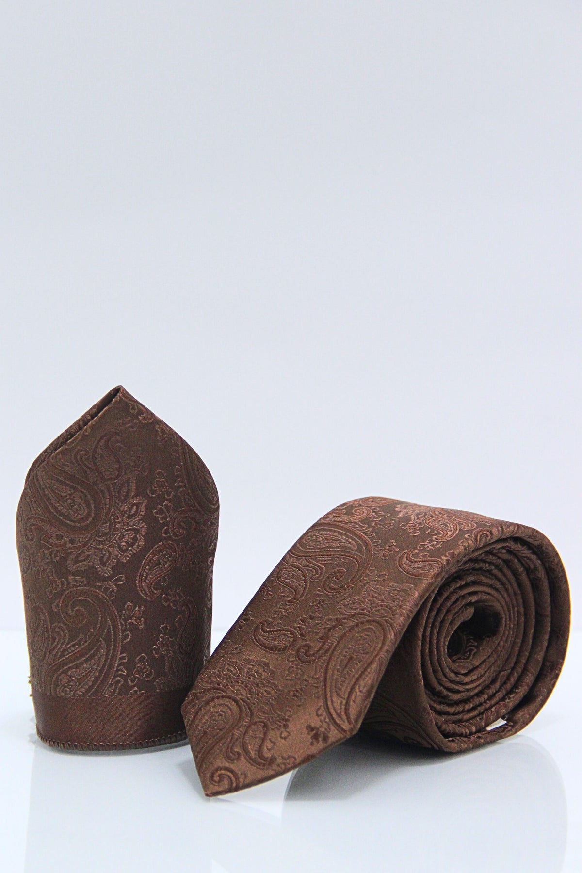 Embrace a distinguished, vintage-inspired look with this brown set byTom Silk. Featuring a warm chocolate hue detailed with a classic paisley swirl, this tie and pocket square set brings a refined, earthy quality to your formal wear. It is an exceptional choice for pairing with tweed jackets or adding depth to a standard navy suit.